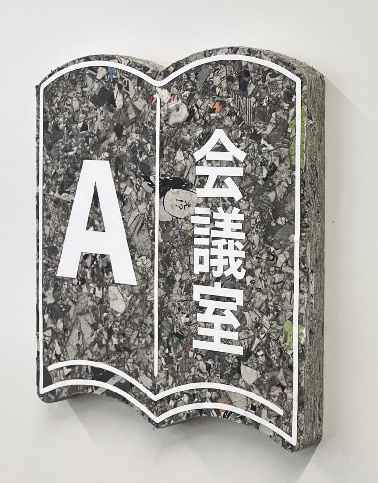 出版社から排出された書籍を細かく破砕し、再構成して成形したアップサイクルボードを会議室サインに活用しました。文字や写真の断片が表面にランダムに現れ、そのまま素材感として立ち上がるデザインです。役目を終えた書籍が、オフィスの中で新たな情報発信の場を示すサインボードとして生まれ変わっています。